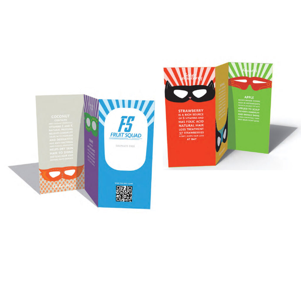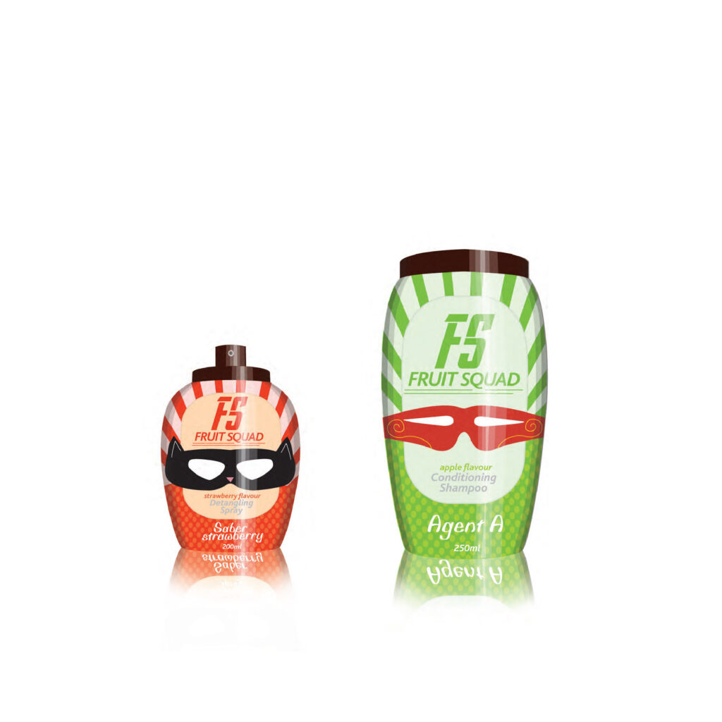 I chose to use superheroes as children love them. Instead of doing the traditional ‘superhero character’ I put hero masks on the bottle, to show that the bottle, or product is the superhero. The style was inspired by comic books.